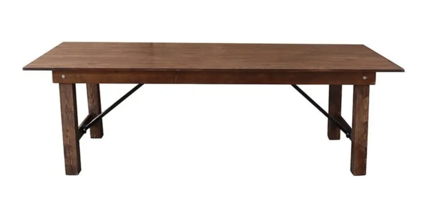 Make your special occasions truly unforgettable with our Fruitwood Folding Farm Tables. Perfect for weddings, backyard events, and more, this stunning 40'' x 96'' table features a beautiful black grain on fruitwood finish that will add a touch of elegance to any setting. The sturdy H-legs provide stability and support, ensuring that your event goes off without a hitch. Pair perfectly with our cross back and fruitwood chairs.