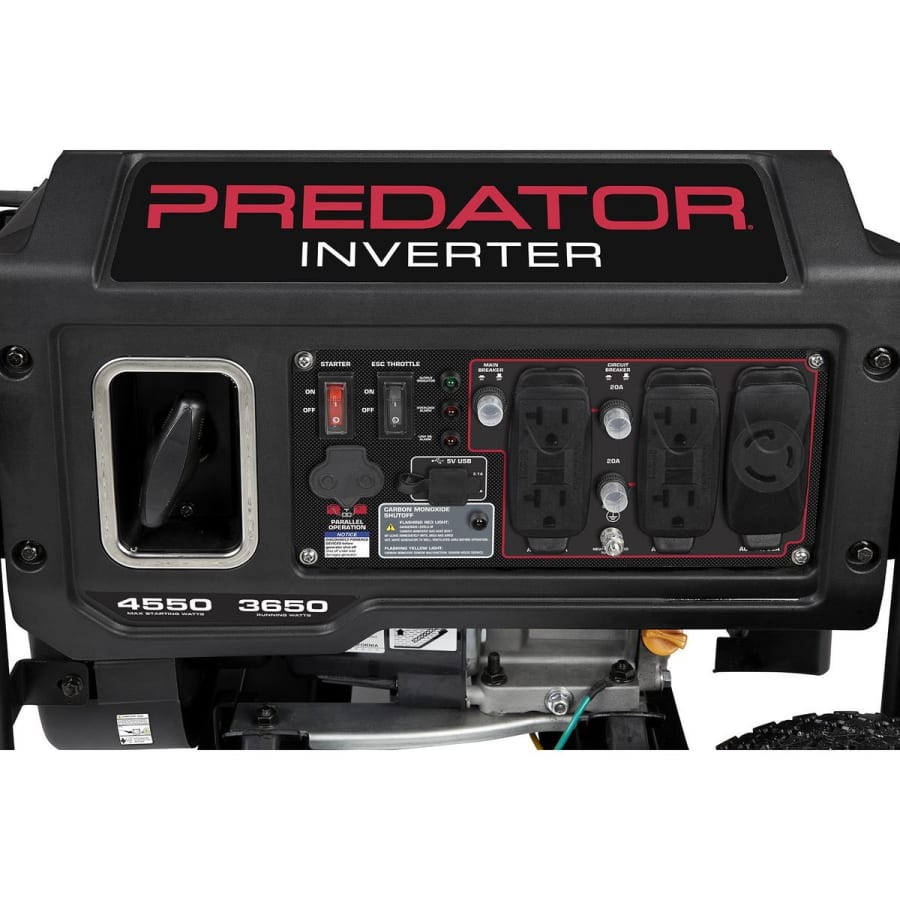 Specs - The PREDATOR® 4550W Max Starting, 3650W Running Inverter Generator uses built-in inverter technology to produce clean power that is safe for sensitive electronics. This inverter generator is designed for efficiency, providing more power with lower fuel consumption, and running over 16 hours per fill-up.
